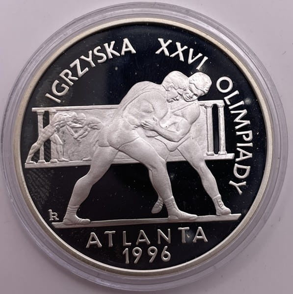 Na rewersie na pierwszym planie przedstawiono stylizowaną parę współczesnych zapaśników podczas zawodów na macie, a w tle wśród antycznych kolumn stylizowaną parę starożytnych zapaśników. U góry monety półkolem napis dużymi literami od lewej strony ku dołowi: Igrzyska XXVI Olimpiady, oraz u dołu monety napis także dużymi literami: Atlanta 1996