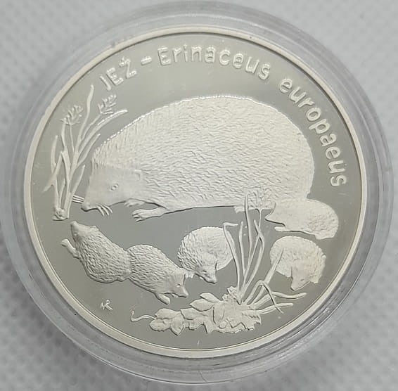 Na rewersie monety dorosły osobnik Jeża, a poniżej pięć młodych jeży pośród roślin. U góry monety przy jej rancie półkolem napis: JEŻ - Erinaceus europaeus.