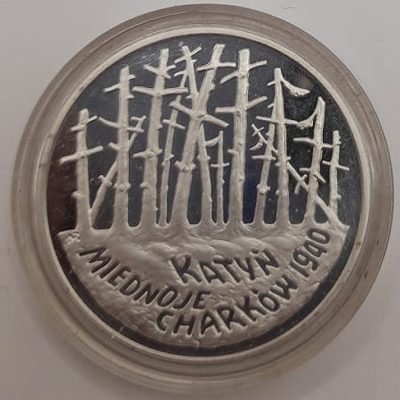 Na rewersie stylizowana polana oraz widok łysych drzew bez liści, część z nich pochyłych z pościnanymi gałęziami przypominających krzyże. U dołu monety przy jej rancie w trzech rzędach zakrzywione stylizowane napisy dużymi literami: Katyń / Miednoje / Charków oraz data 1940