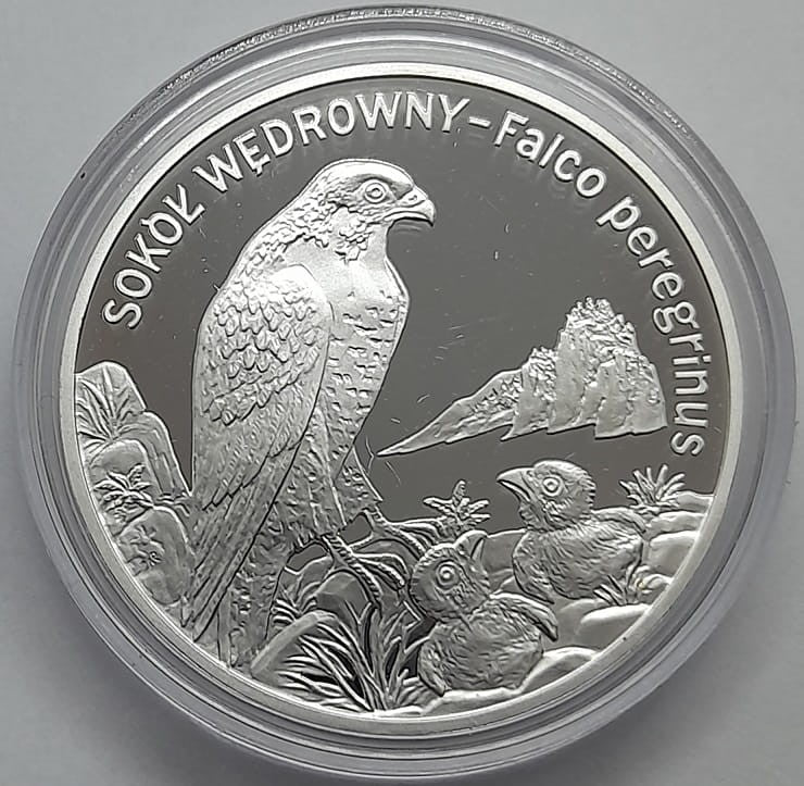 20 złotych Sokół wędrowny 2008 r. - srebrna moneta kolekcjonerska, producent Mennica Polska S.A., z serii Zwierzęta Świata, numer 15 z serii 22 monet, stempel lustrzany, moneta w kapslu ochronnym, stan zachowania L/L