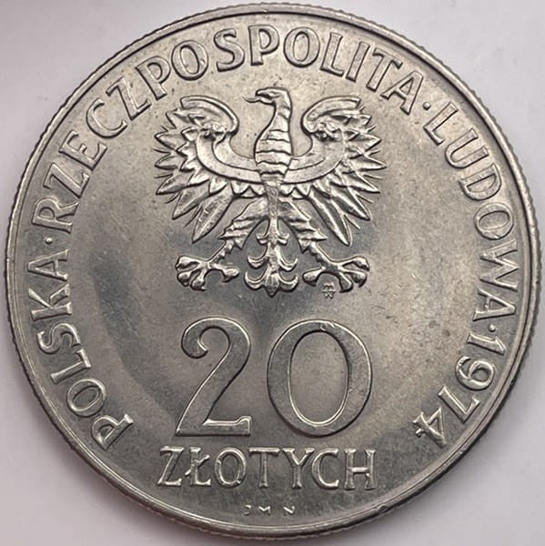 Na awersie monety w jej centralnym miejscu orzeł bez korony godło ustanowione dla Rzeczpospolitej Polski Ludowej. W otoku monety przy rancie napis: POLSKA RZECZPOSPOLITA LUDOWA oraz rok emisji monety 1974. W dolnej części monety nominał w zapisie 20 \ ZŁOTYCH. Pod nominałem przy rancie monety inicjały projektanta JMN. Pod lewą łapą orła znak mennicy: m/w