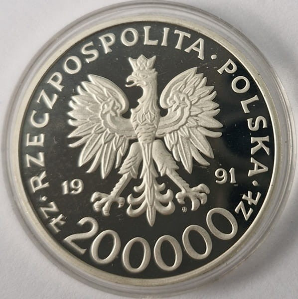 Srebrna moneta kolekcjonerska z kategorii monety kolekcjonerskie z lat 90-tych o nominale 200 000 zł, producent Mennica Polska S. A., stempel lustrzany, średnica 35 mm, masa monety 19,30 gram, wielkość emisji 25 000 sztuk, rok emisji 1991, stan zachowania menniczy, real foto