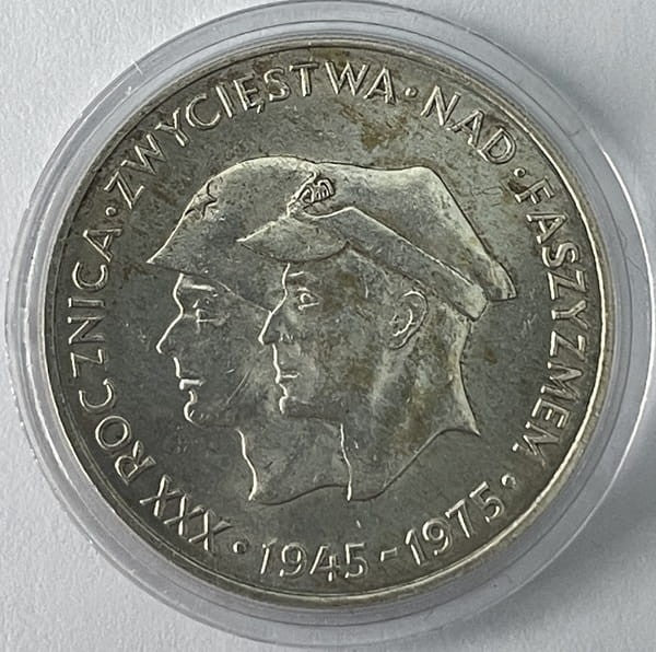 200 zł XXX rocz. zwycięstwa nad faszyzmem 1975 r. - moneta okolicznościowa PRL srebro 200 złotych NBP, producent Mennica Polska S.A., temat indywidualny, stempel zwykły, moneta w kapslu ochronnym, stan zachowania -1, real foto