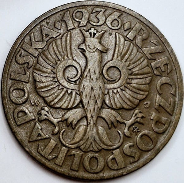 5 groszy 1936 r. - moneta obiegowa z okresu II Rzeczpospolitej Polskiej, metal brąz, emitent Bank Polski, producent Mennica Państwowa, stempel zwykły, stan zachowania -2, real foto