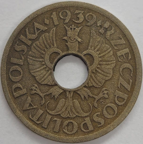 Moneta obiegowa na utworzonym na ziemiach polskich Generalnym Gubernatorstwie. Moneta bita zwykłym stemplem z otworem w środku, metal cynk, stan zachowania +2, real foto