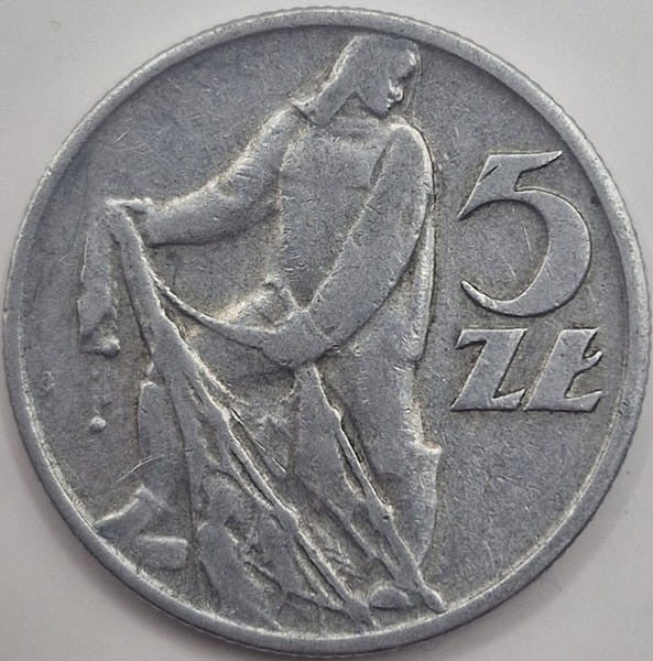 Moneta obiegowa PRL, producent Mennica Polska S.A., z serii monet rocznikowych 5 złotych z Rybakiem, projektant rewersu Józef Gosławski, projektant awersu Wojciech Jastrzębowski, metal aluminium, stempel zwykły, stan zachowania około menniczy 3/+3