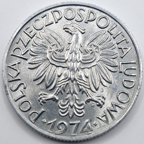Na awersie w centrum widnieje orzeł bez korony ustanowiony dla godła Polskiej Rzeczpospolitej Ludowej. W otoku monety przy jej rancie napis dużymi literami: Polska Rzeczpospolita Ludowa oraz rok emisji monety 1974 na dole przy rancie oddzielony od napisu na początku i na końcu rąbami. Pod lewą łapą orła znak mennicy: m/w. Nad prawą łapą orła znak W, nad lewą łapą znak J