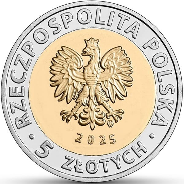Na awersie widnieje orzeł w koronie ustanowiony dla godła Rzeczypospolitej Polskiej. Między szponami orła znak mennicy: m/w. W dolnej części monety rok emisji: 2025. Wzdłuż otoku na wydzielonym pierścieniu z miedzioniklu nominał monety w zapisie: 5 ZŁOTYCH z powiększoną cyfrą w porównaniu do napisu. W górnej części monety napis dużymi literami: Rzeczpospolita Polska. Nominał monety po obu stronach oddzielony od napisu ozdobnym jednym koralikiem
