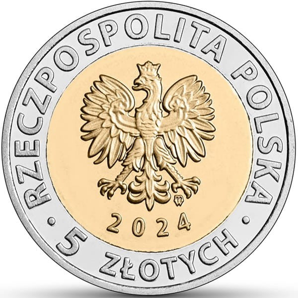 Na awersie widnieje orzeł w koronie ustanowiony dla godła Rzeczypospolitej Polskiej. Między szponami orła znak mennicy: m/w. W dolnej części monety rok emisji: 2024. Wzdłuż otoku na wydzielonym pierścieniu z miedzioniklu nominał monety w zapisie: 5 złotych z powiększoną cyfrą w porównaniu do napisu. W górnej części monety napis dużymi literami: Rzeczpospolita Polska. Nominał monety po obu stronach oddzielony od napisu ozdobnym jednym koralikiem