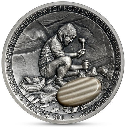 Na rewersie monety widnieje stylizowany wizerunek pradziejowego górnika w czasie prac oraz wstawka w kształcie elipsy z naturalnego krzemienia pasiastego. Wokół rantu monety na wyodrębnionej płaszczyźnie napis: 100. ROCZNICA ODKRYCIA ZESPOŁU PRADZIEJOWYCH KOPALNI KRZEMIENIA PASIASTEGO "KRZEMIONKI"