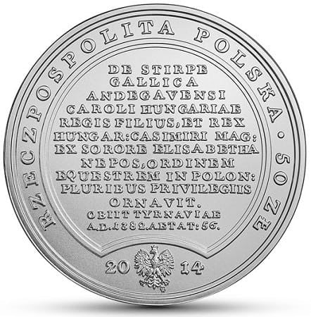 Na rewersie medalu (na awersie monety w skróconym tekście) czytamy w tłumaczeniu: Z rodu francuskiego, syn Karola Andegaweńskiego, króla Węgier, król węgierski, Kazimierza Wielkiego z siostry Elżbiety siostrzeniec, stan rycerski w Polsce wielu swobodami ozdobił. Umarł w Trnawie Roku Pańskiego 1382, mając lat 56, panując w Polsce lat 12, dnia 12 września.