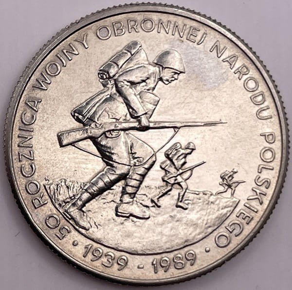 Na rewersie widnieją stylizowane wizerunki trzech żołnierzy na polu walki biegnących do ataku. Wokół rantu monety napis dużymi literami: 50 rocznica wojny obronnej narodu polskiego, rozpoczęty i zakończony kropkami, które oddzielają daty 1939-1989.